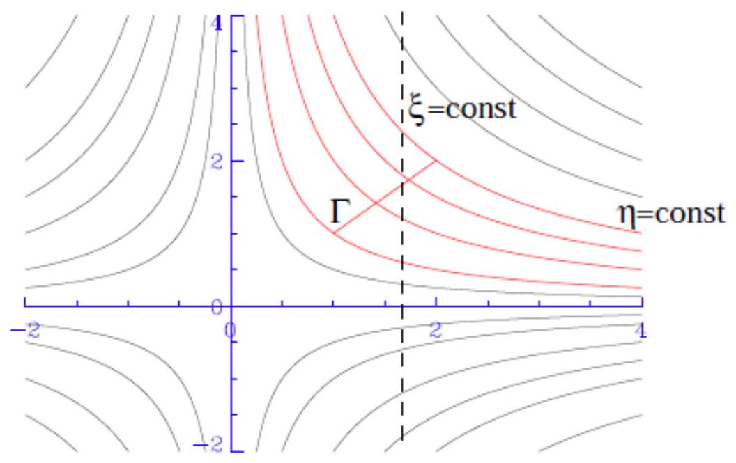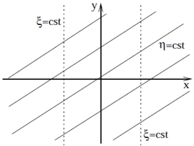 So, we have made the coefficient of w/η vanish in the transformed equation (2.4), by choosing ηη(x,y), with η(x,y)=k an equation defining the solution of the characteristic equation (2.5). We can now choose ξ arbitrarily (or at least to suit our convenience), providing we still have J0. An obvious choice is