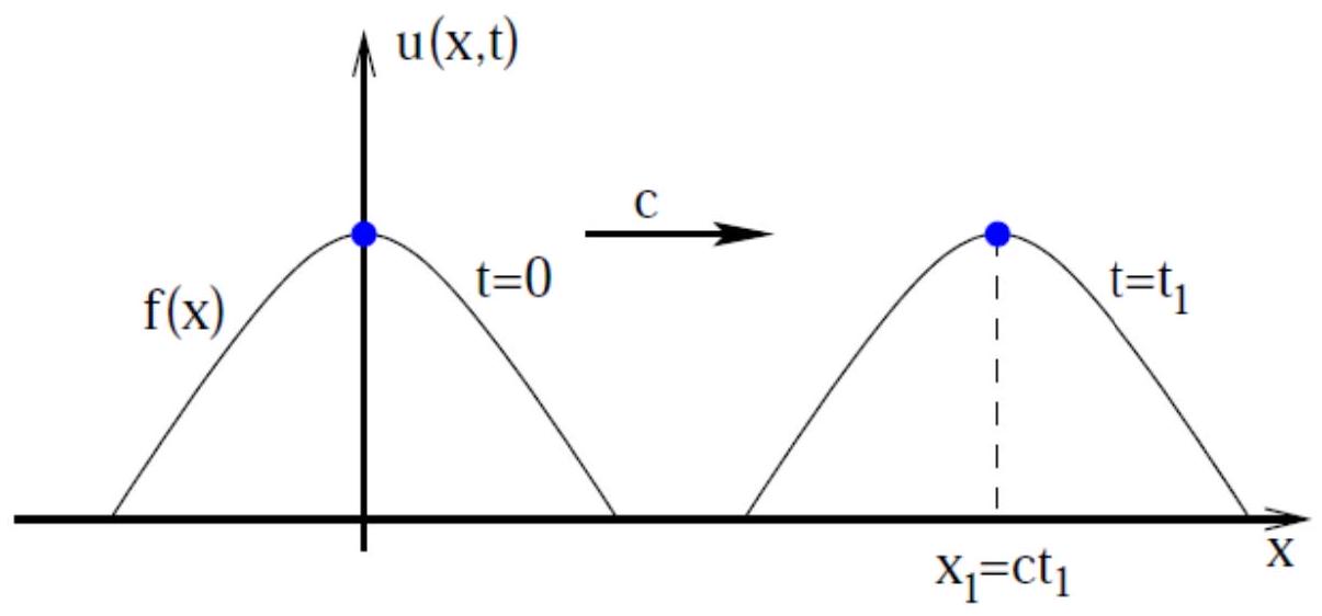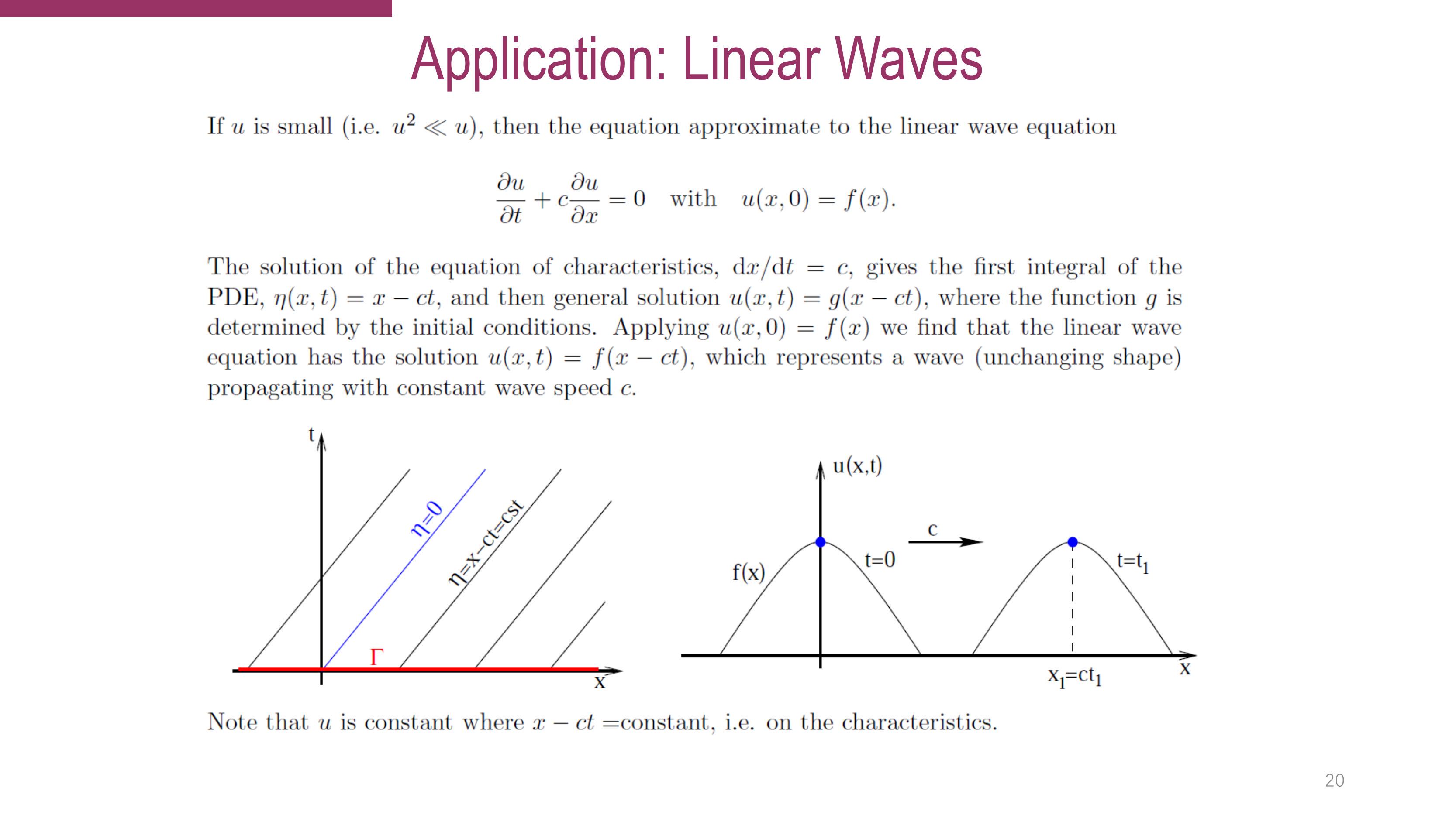 The solution of the equation of characteristics, dx/dt=c, gives the first integral of the PDE, η(x,t)=xct, and then general solution u(x,t)=g(xct), where the function g is determined by the initial conditions. Applying u(x,0)=f(x) we find that the linear wave equation has the solution u(x,t)=f(xct), which represents a wave (unchanging shape) propagating with constant wave speed c.